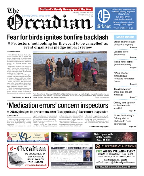 On the front page, we share the news that organisers of Kirkwall Bonfire are to conduct a review of the annual community event, in the wake of a petition calling for its relocation. A group concerned for the impact the fireworks display has on birdlife at the Peedie Sea have received the backing of hundreds of signatories, as well as the broad support of a national animal welfare charity.
