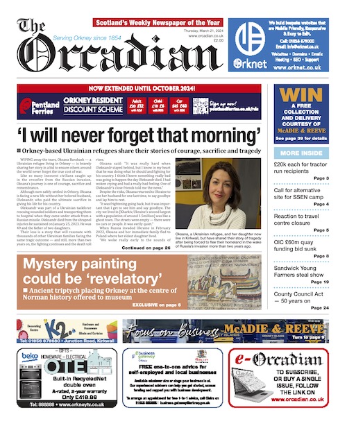 On the front page, we share the stories of Orkney-based Ukrainian refugees, two years on from the outbreak of war. Oksana Barabash, who lives in Kirkwall, now faces life without her husband, who paid the ultimate sacrifice in giving his life for his country.