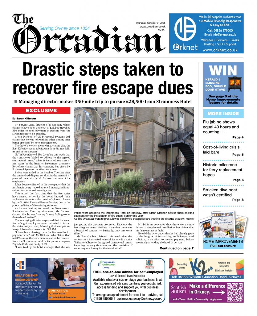 On the front page this week, we have an exclusive story after police attended an incident in Stromness on Tuesday, which saw an East Kilbride businessman travel to Orkney to attempt to recover an unpaid five-figure sum from The Stromness Hotel.