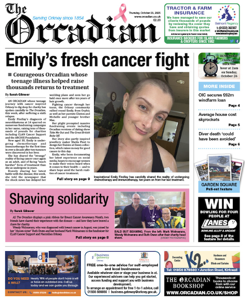 Also on the front page this week, as The Orcadian displays a pink ribbon for Breast Cancer Awareness Month, two friends have shared their experience with the disease — and how they have braved a shave for charity.