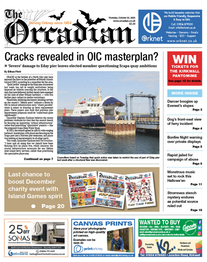 Our front page story asks: Have cracks in Eday’s pier exposed the flaws in Orkney Islands Council’s marine priorities?